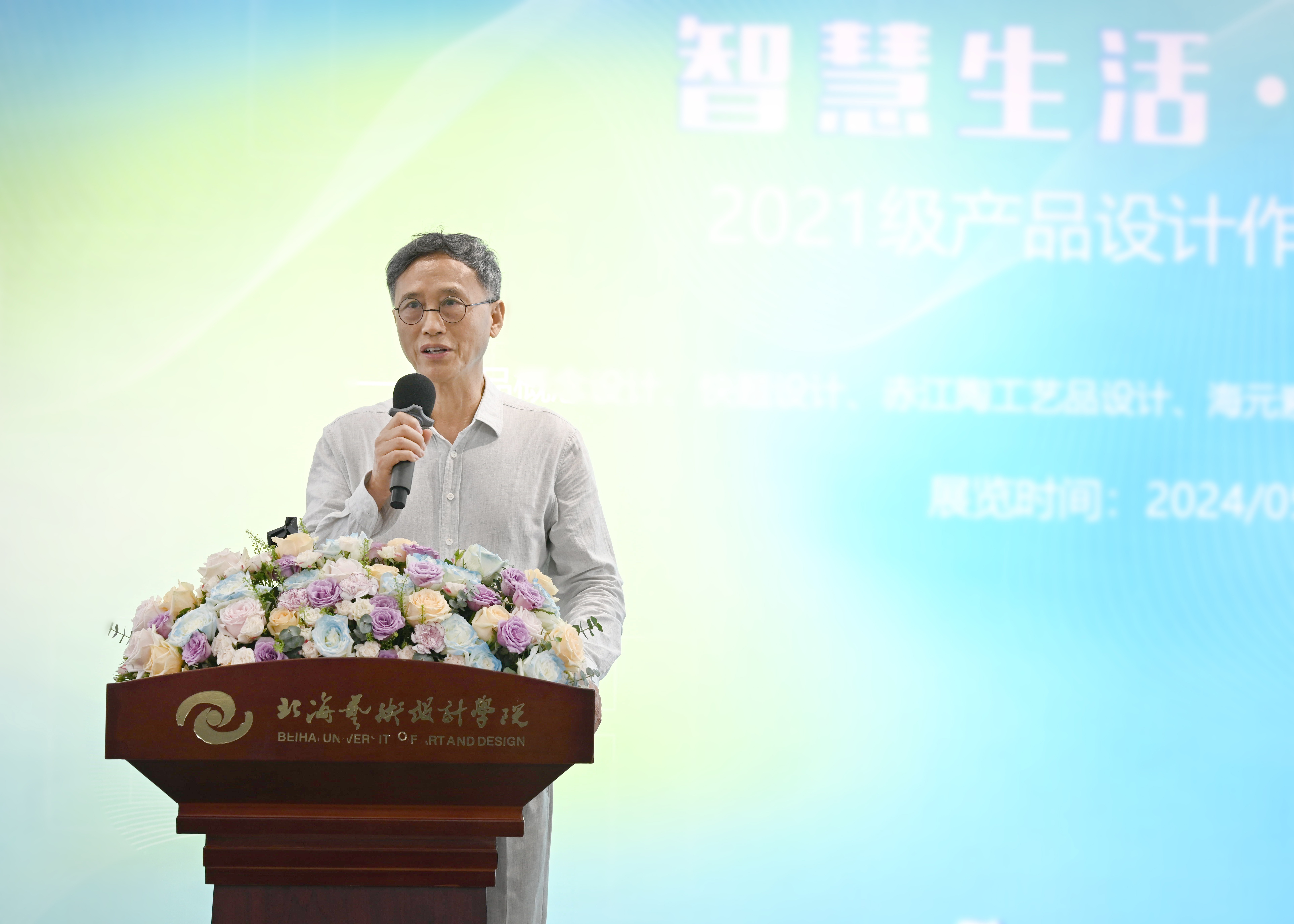 2024年5月27日上午,我院产品设计专业“智慧生活·创意未来——2021级产品设计作品展”在南校区艺德楼8楼北侧展厅拉开帷幕。此次展览集结了产品设计专业学生们的创新成果,吸引了众多嘉宾的关注和参与。校长卢新华、中国工艺美术大师利成世、学院院长李林平、副院长白建强、贾荣建教授、北海市工业发展促进中心工艺美术科科长钟志慧、广西工艺美术大师陈建炜、北海喜蛙家居设计有限公司总经理何一夫及产品设计专业师生们共同出席了开幕式。开幕式活动由产品设计专业教师陈书娟主持。