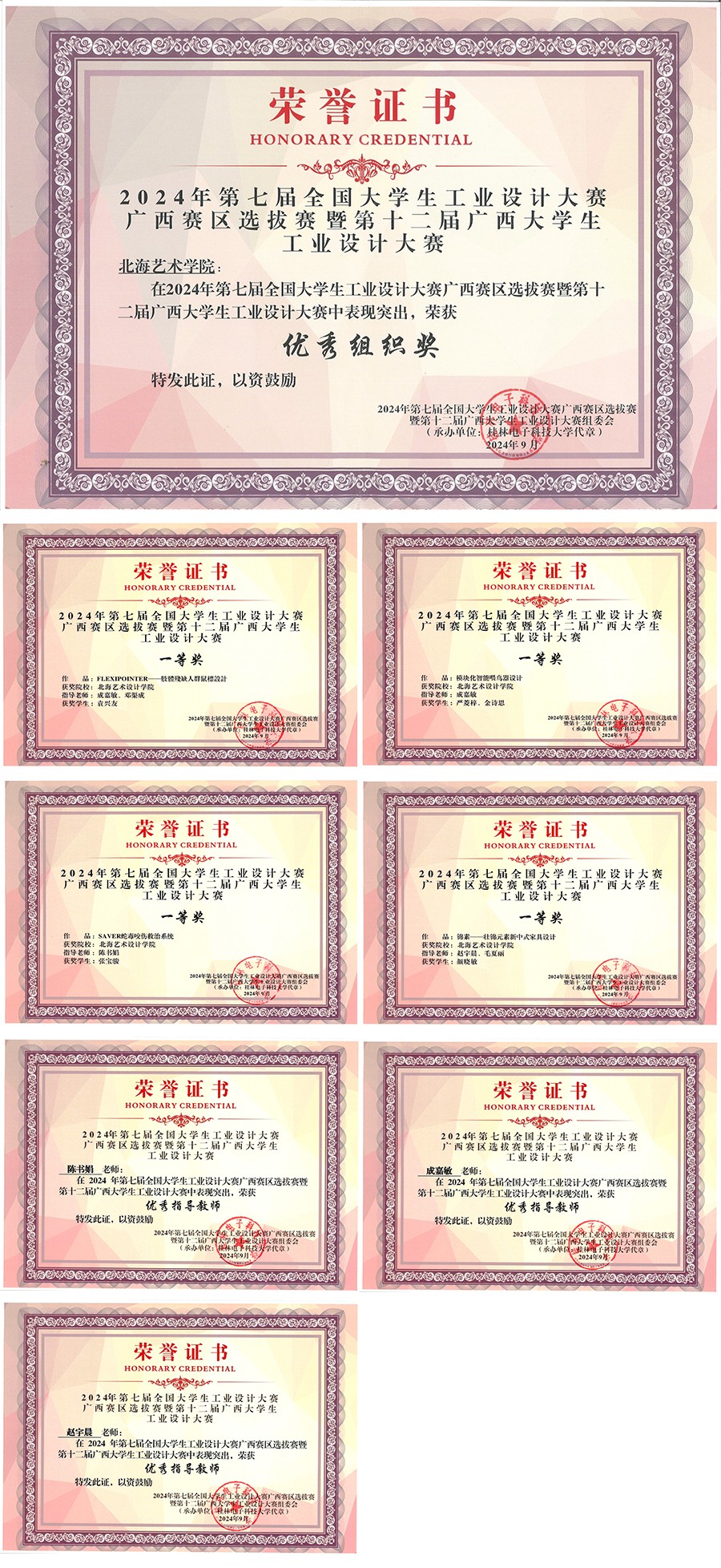 近日,喜讯传来,我院师生在2024年全国大学生工业设计大赛广西赛区中斩获佳绩。在本次比赛中荣获奖项33项,其中,一等奖4项,二等奖6项,三等奖23项,3名教师被评为“优秀指导教师”,我院荣获“优秀组织奖”。