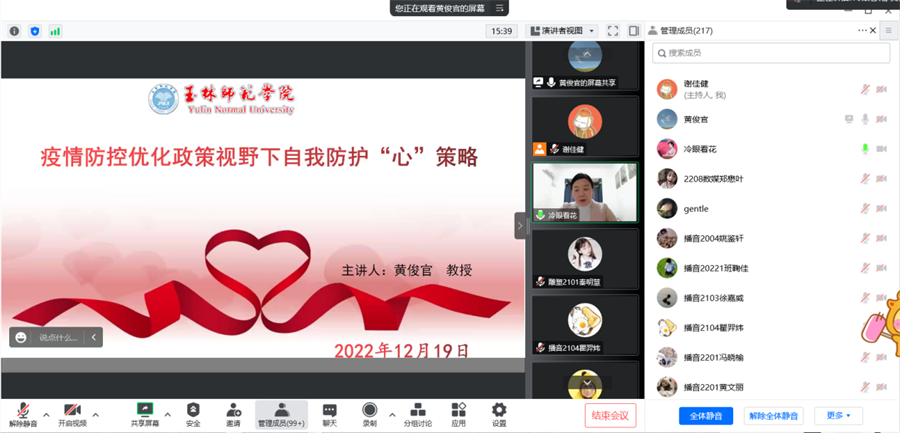 为进一步帮助学生纾解情绪,引导广大师生以积极向上的心态进行自我防护。12月19日,我校邀请玉林师范学院黄俊官教授做主题为“疫情防控优化政策视野下自我防护‘心’策略”的线上讲座。各班级班长、心理委员以及部分教师和学生在线观看讲座。会议由学工处副处长兼心理健康教育中心主任刘玲花主持。