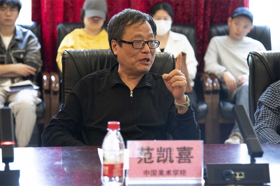 范凯喜教授针对设计艺术学院的学科建设提出了四点思考方向:一是专业目录更新慢,专业课程方向要创新;二是加快引进人才及教师队伍建设,明确人才是第一资源意识;三是创新科技体制机制,激发教师科研工作的内生动力;四是学院抢抓机遇,加快“艺术+科技”融合布局,为此,范教授专门题字以作勉励。
