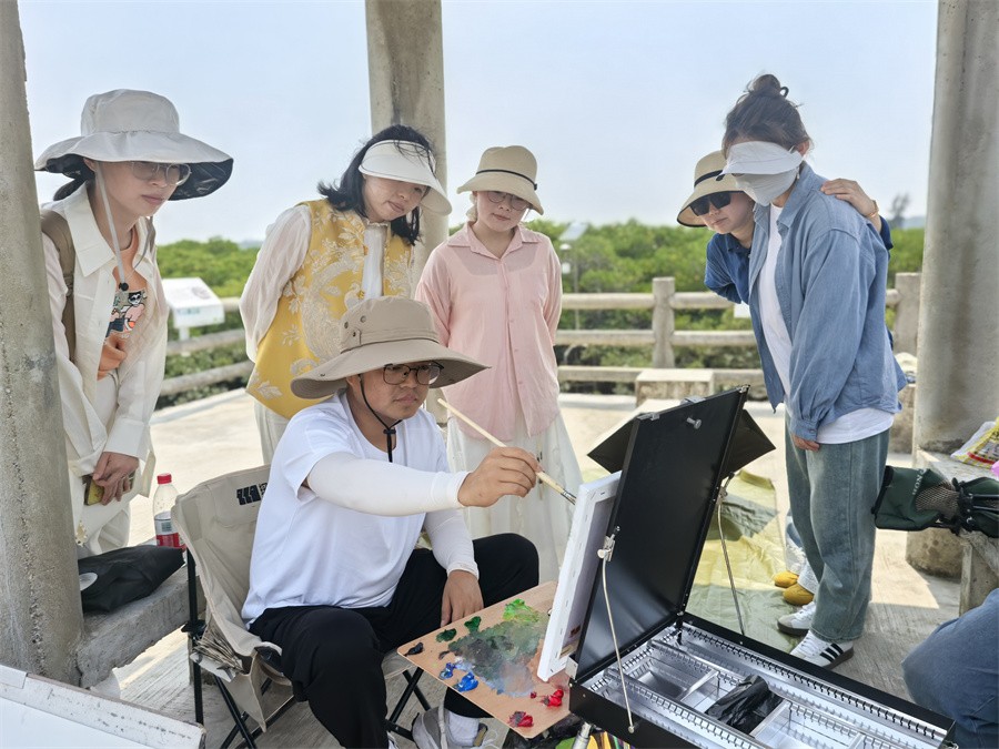 王伟教授手持画笔,在红树林里构思创作。他表示,红树林是珍贵的生态资源,能够用画笔记录下这片美丽的红树林,让更多的人了解它、关注它、保护它,感到非常有意义。